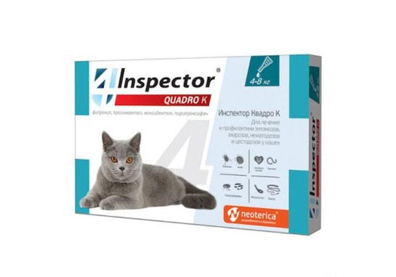 Inspector Quadro – один от всех! Комплексный препарат против 20 видов наружных и внутренних паразитов. Inspector Quadro защищает кошек: 1 месяц от: Иксодовых клещей (переносят гемобартонеллез и др. болезни); Круглых гельминтов и их личинок (нематодозы); Ленточных гельминтов (цестодозы); Ушного клеща (отодектоза); Подкожных клещей (нотоэдроза); Сердечных гельминтов (микрофиллярий) дирофиляриоз. 1,5 месяца от: Блох, власоедов и их личинок.